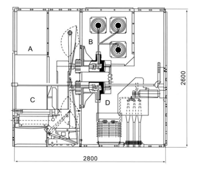 | Dimensions (WxDxH): 1400x2800x2600 | Schematic diagram of the structure of the ຕັດຈໍ ເອ relay instrument room B bus room C circuit breaker room D cable |