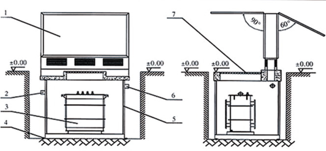 | Fig. 1 Schematic diagram of semi-buried box ໂປຣເເກຣມ structure 1-Light box-type power distribution equipment: 2-High-voltage cable inlet hole; 3-Underground combined ໂປຣເເກຣມ: 4-Pitpit foundation installation hole 5-Prefabricated ground play foundation; 6-Low-voltage cable outlet hole; 7-Pit operation port cover |
