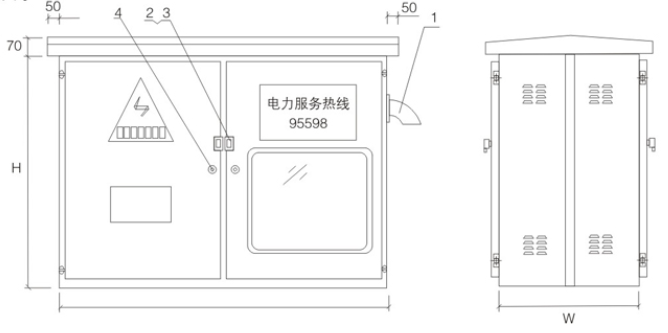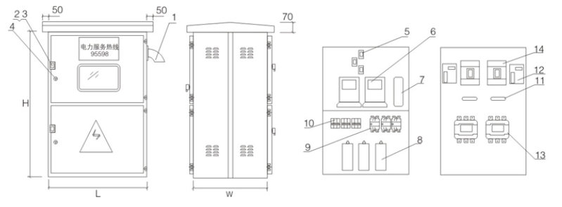 1. Inlet cable through pipe 2, door lock (open lock) 3, door lock rain box 4, door lock (hidden lock) 5, current transformer 6, meter 7, junction box 8, capacitor 9, switching fused contactor 10, small circuit breaker 11, isolation switch 12, zero sequence transformer 13, leakage current circuit breaker 14, outgoing ເອC contactor 15, outgoing air switch
